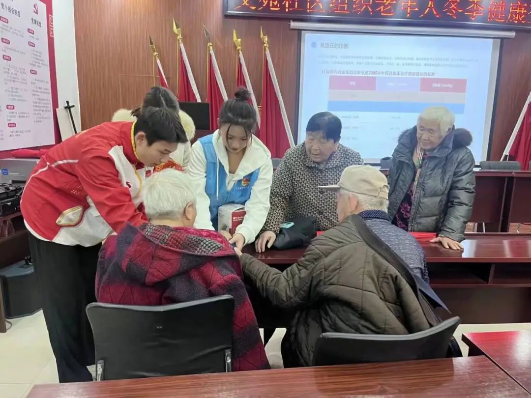 本次活动围绕宣传高血压知识与测量血压两方面展开。志愿队通过宣讲的方式,从高血压的危险性、高血压的症状表现、引起高血压的因素、如何控制高血压等方面,多角度的介绍了高血压的危险性,重点讲解了如何控制高血压。宣讲完成后,团队成员为社区居民开展测量血压的活动,通过“平,卷,包,读,记”五字口诀的操作细节,精准测量每一位居民的血压,并通过测量结果给出适当的建议,提醒老人注意日常生活习惯,健康饮食,每日进行适当锻炼,增强身体素质。此次实践活动为社区的老人提供了医疗服务的同时,也增强了社区老人预防疾病的保健意识,让老人感受到了社会给予的温暖和关怀。